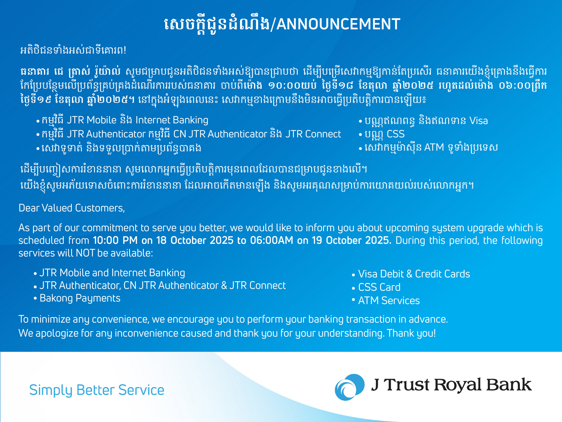 The rates above are for indicative purpose only and only applicable for Swift Transfer. For the updated rates, please refer to your nearest JTRB branch or call +85523 999 910.
