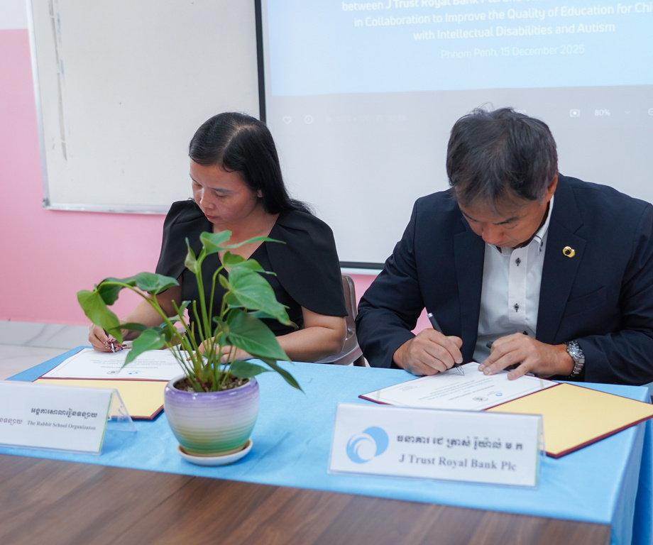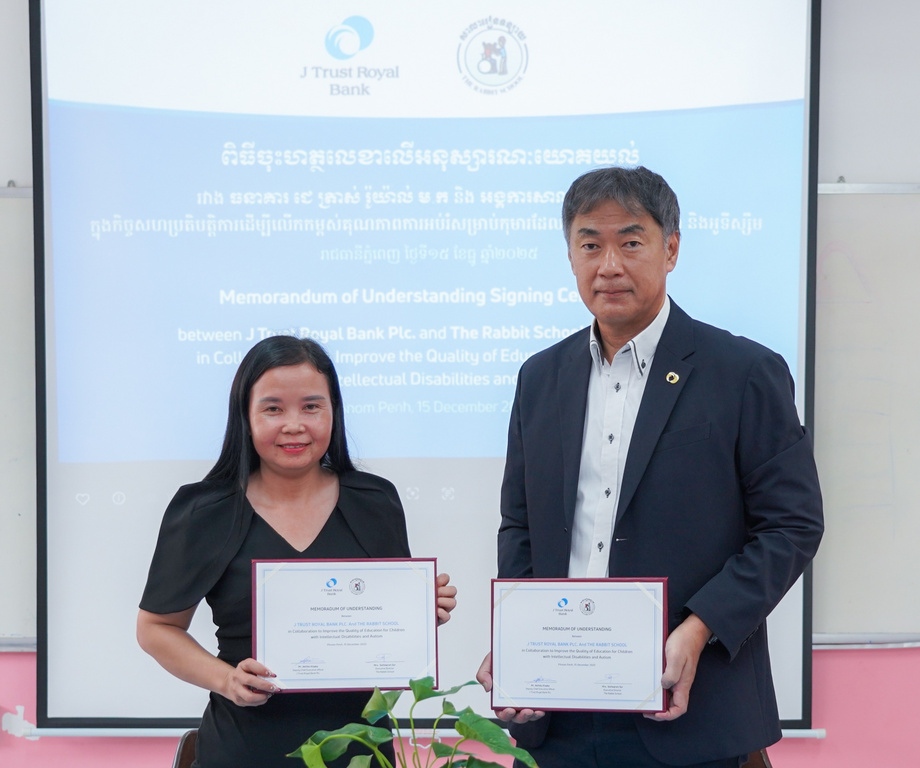 Phnom Penh, 15 December 2025 - J Trust Royal Bank formalized a Memorandum of Understanding (MoU) with the Rabbit School Organization to support inclusive and quality education. The signing ceremony, which took place at the Rabbit School Organization, was presided over by Mrs. Sothearom Sor, Executive Director of the Rabbit School Organization, and Mr. Akihiko Kisaka, Deputy CEO of J Trust Royal Bank, and senior management from both institutions.