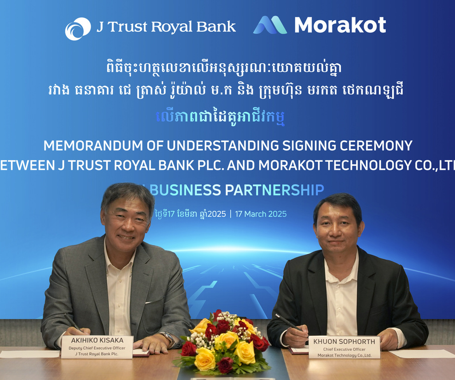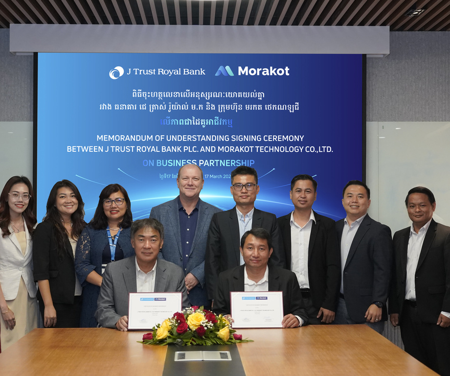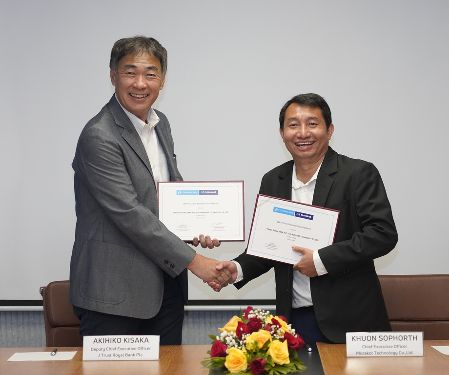 Phnom Penh, 17 March 2025: J Trust Royal Bank and Morakot Technology entered into business partnership through the signing of a Memorandum of Understanding (MoU) at J Trust Royal Bank Head Office, with the objective to collaborate on integrating their software applications with the goal of enhancing digital payment solutions for small and medium-sized enterprises (SMEs).