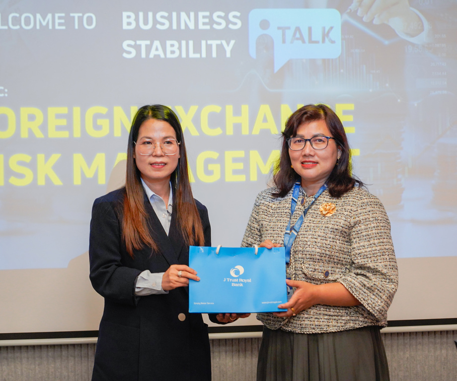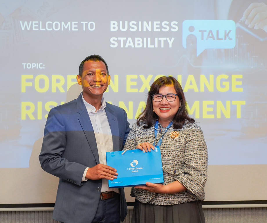 J Trust Royal Bank hosted its first Business Stability Talk on Foreign Exchange Risk Management on 20 March 2025 at the Bank's head office. It facilitated the transfer of expertise from experienced professionals—Mr. Sophina Khiev, Head of Markets, J Trust Royal Bank, and Ms. Thida Kong, Chief Finance Officer, Hanuman Beverages. Through this sharing session, participants gained a better understanding of the challenges and opportunities associated with foreign exchange, which can benefit their businesses.